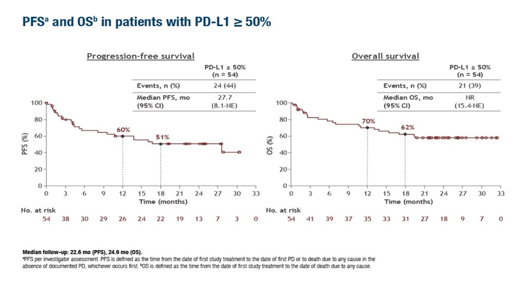 Theo dữ liệu cập nhật từ thử nghiệm KRYSTAL-7 giai đoạn II, sự kết hợp adagrasib cộng với pembrolizumab tiếp tục có hiệu quả đáng khích lệ trong điều trị bước đầu cho 54 bệnh nhân mắc NSCLC giai đoạn tiến triển hoặc di căn đột biến KRAS G12C và PD-L1 ≥50%. Tỷ lệ đáp ứng khách quan (ORR) là 59% và thời gian đáp ứng trung bình (DOR) là 26,3 tháng. Với thời gian theo dõi trung bình hơn 22 tháng, thời gian sống không bệnh tiến triển (PFS) trung bình là 27,7 tháng và tỷ lệ sống toàn bộ (OS) sau 18 tháng là 62%.
