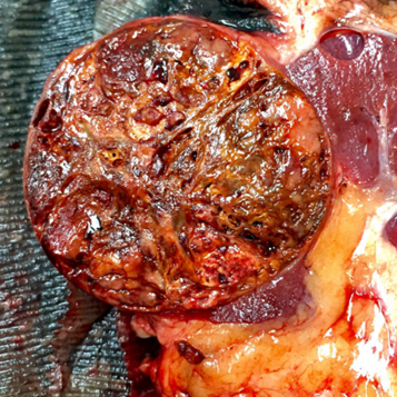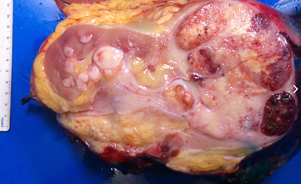 Hình 4. ccRCC đa ổ, với diện cắt đại thể loang lổ, khối u màu vàng óng xen kẽ các vùng xơ hóa và xuất huyết. Các vùng mềm, dạng thịt, màu nâu nhạt đến trắng xám trong khối u có thể gợi ý sự biệt hóa sarcomatoid.