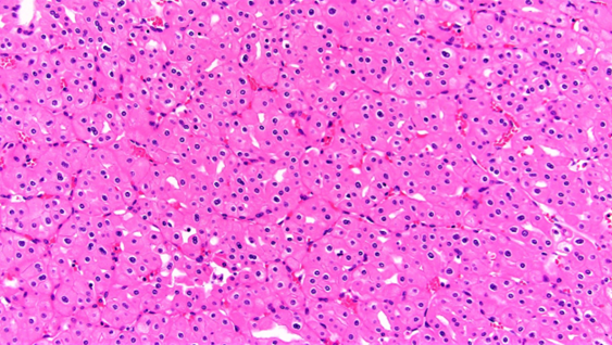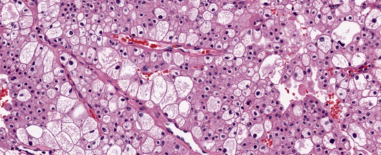 Hình 10. ChRCC thể điển hình được cấu tạo bởi các tế bào đa giác lớn với bào tương sáng, dạng lưới, xen kẽ với các tế bào nhỏ hơn có bào tương eosin. Lưu ý rằng các tế bào lớn có bào tương rất phong phú đến mức trong một số mặt cắt mô, nhân không nằm trong mặt phẳng cắt, khiến các tế bào này có hình ảnh như không nhân.
