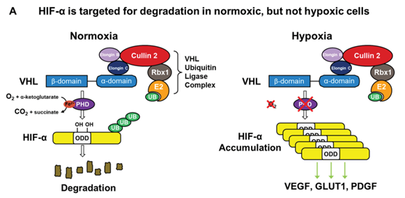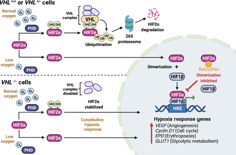 Tăng hồng cầu cận u liên quan đến nồng độ erythropoietin tăng cao, được sản xuất bởi tế bào u ung thư biểu mô tế bào thận khi VHL bị bất hoạt.