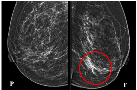 Hình 1: X-quang tuyến vú 2 bên. Hình ảnh đám tăng đậm độ bất xứng ¼ dưới trong bên trái)