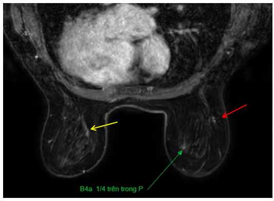 Hình 2:Cộng hưởng từ tuyến vú (Mũi tên vàng: Tổn thương BIRADS 4C; Mũi tên đỏ: Tổn thương BIRADS 4B; Mũi tên xanh: Tổn thương BIRADS 4A)
