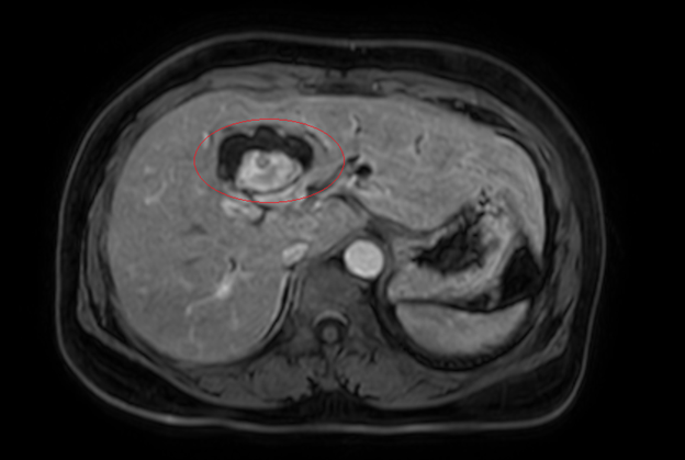 Đánh giá tổn thương trên phim chụp cộng hưởng từ: Nhu mô hạ phân thuỳ IV có ổ tổn thương dạng dịch, kích thước 38x52mm, trong có vài sỏi, sỏi lớn nhất kích thước ~27x37mm, có thông với nhánh đường mật gan phải lân cận, ngấm thuốc viền sau tiêm, chèn ép ngã ba đường mật, gây giãn đường mật trong gan hai bên