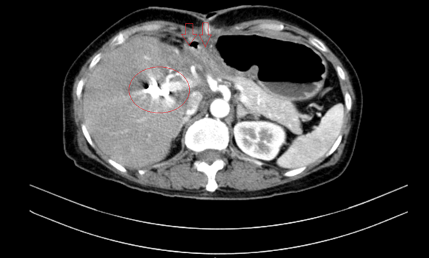Hình 7. Phim chụp cắt lớp vi tính vụng cho thấy phần gan trái đã cắt (hình mũi tên)- Sonde dẫn lưu đường mật gan phải( vòng tròn đỏ).