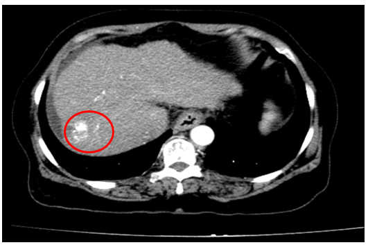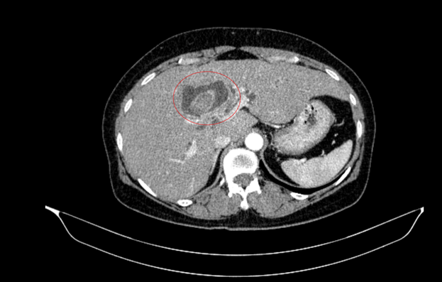 Tháng 01/2025 Bệnh nhân ở nhà xuất hiện mỏi, vàng da, ngứa kèm sốt kéo dài một tháng, đợt này đau bụng mạn sườn phải, kèm vàng da tăng dần, đi khám ở bệnh viện tuyến dưới, siêu âm có sỏi đường mật gan trái kích thước 22×41 mm. Bệnh nhân được chuyển đến bệnh viện Bạch Mai và được chụp CT ổ bụng phát hiện, kết quả: Gan có kích thước bình thường, bờ đều, nhu mô hạ phân thuỳ IV có ổ tổn thương dạng dịch kích thước 40x53mm, trong có sỏi lớn đường kính 35mm.