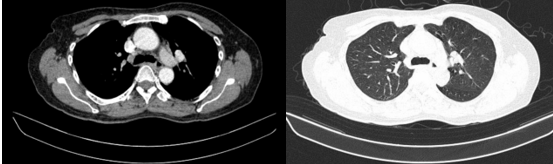 Hình ảnh chụp cắt lớp vi tính ngực: Dải xẹp phổi rải rác thuỳ dưới hai phổi. Nhu mô còn lại đồng nhất, không thấy tổn thương khu trú hoặc lan tỏa. Không thấy tổn thương hình mờ dạng lưới. Không thấy giãn phế quản – phế nang.