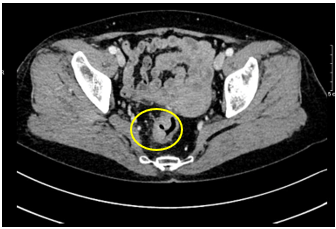 Hình 4: Hình ảnh miệng nối đại–trực tràng qua CLVT, miệng nối thông tốt, không ghi nhận rò rỉ/ bục miệng nối, không có tụ dịch, không thấy khối bất thường choán chỗ.