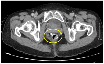 Hình 2: Hình ảnh khối u trực tràng giữa qua chụp CLVT. Trực tràng giữa thành dày không đều quanh chu vi, chỗ dày nhất 17mm, trên đoạn dài 40mm, không rõ cấu trúc lớp, ngấm thuốc mạnh sau tiêm.
