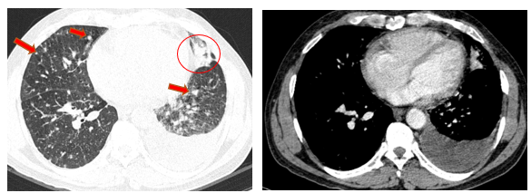 • Chụp cắt lớp vi tính lồng ngực (08/2025): Khối rốn phổi trái ôm quanh nhánh phế quản thùy dưới trái kích thước 28x26mm, dày tổn chức kẽ vách liên tiểu thùy và nhiều nốt đặc lan tỏa khắp nhu mô, đường kính <7mm. Màng phổi trái có vài nốt đặc ngấm thuốc nốt lớn nhất kích thước 17x15mm Khoang màng phổi trái có dịch dày 54mm. Nhiều hạch to trung thất, rốn phổi hai bên và hố thượng đòn có hoại tử trung tâm, hạch lớn nhất kích thước trục ngắn 22mm.