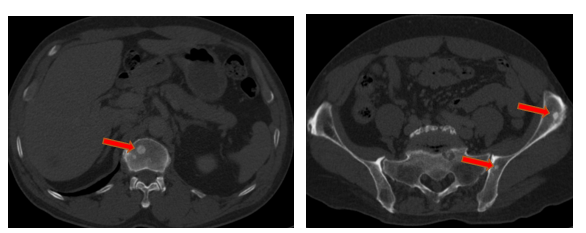 • Chụp cắt lớp vi tính ổ bụng (08/2025): Nhu mô gan phải có vài nốt, nốt lớn nhất hạ phân thùy VII có nốt giảm tỷ trọng, ngấm thuốc kém sau tiêm đường kính 24mm, hạ phân thùy II, III có nốt 2 giảm tỷ trọng đường kính 13mm và 27mm. Các ổ đặc xương rải rác đốt sống ngực thắt lưng, xương cùng và xương chậu hai bên – theo dõi tổn thương thứ phát