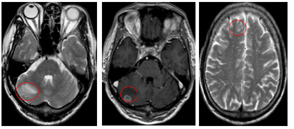 • Cộng hưởng từ sọ não (08/2025): Nhu mô bán cầu đại não, tiểu não phải, thái dương trái có các nốt lớn nhất đường kính 13mm, giảm tín hiệu trên T1W, tăng tín hiệu trên T2W, phù não xung quanh, ngấm thuốc mạnh sau tiêm – theo dõi tổn thương thứ phát