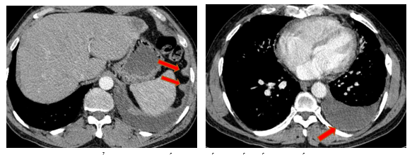 Hình 03: Màng phổi trái có vài nốt đặc ngấm thuốc nốt lớn nhất kích thước 17x15mm  Khoang màng phổi trái có dịch dày 54mm