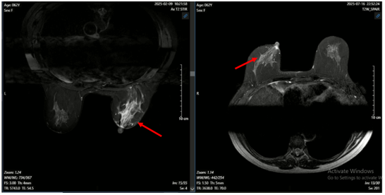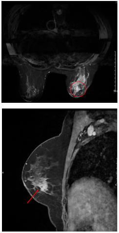 Hình ảnh MRI vú: Nhu mô góc 1/4 dưới ngoài có khối tăng tín hiệu trên T2W, giảm tín hiệu trên T1W, hạn chế khuếch tán trên DWI, ADC, bờ tua gai không đều, kích thước 19x22mm, ngấm thuốc mạnh tăng dần sau tiêm, có vài dải ngấm thuốc lan dọc ra núm vú (BIRADS 5).