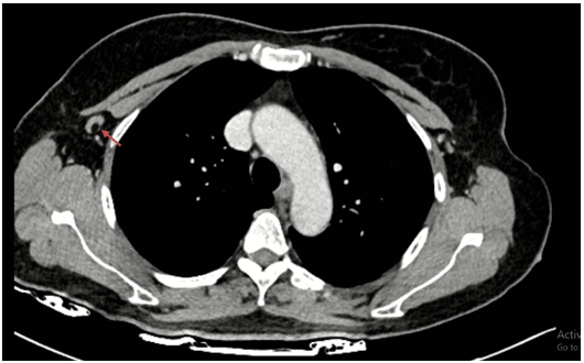 Chụp cắt lớp vi tính lồng ngực: Không phát hiện hình ảnh bất thường ở nhu mô vú phải.