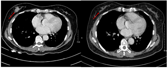 Hình 6. Hình ảnh CT u vú trước điều trị (bên trái) và sau điều trị (bên phải): Trước điều trị: 1/4 dưới ngoài vú phải có nốt đường kính 20mm, bờ ranh giới không rõ, ngấm thuốc sau tiêm. Sau điều trị: Không phát hiện hình ảnh bất thường ở nhu mô vú phải.