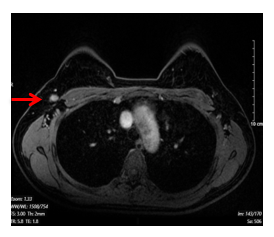 Hình 2. Hình ảnh chụp cộng hưởng từ tuyến vú. Hạch hố nách bên phải, có vỏ dày, kích thước 7x13mm (mũi tên màu đỏ)
