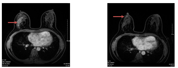 Hình 3. Hình ảnh cộng hưởng từ tuyến vú trước và sau điều trị: Khối u vú giảm kích thước, còn nốt kích thước 5mm, ngấm thuốc sau tiêm (mũi tên màu đỏ