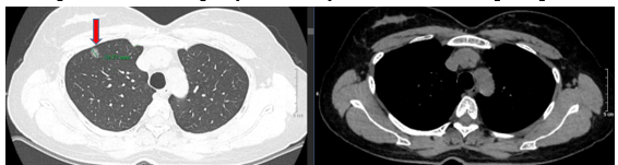 • Chụp cắt lớp vi tính lồng ngực (trước mổ), kết quả cho thấy: Nhu mô thùy trên phổi phải có nốt bán đặc bờ không đều đường kính 10mm (có tính chất ác tính), nốt kính mờ đường kính 7mm. Không thấy hạch to hay khối choán chỗ trong trung thất.