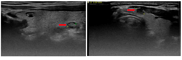 Hình 2: Hình ảnh siêu âm tuyến giáp và vùng cổ có nhân giảm âm thùy phải và eo tuyến giáp khoảng 5mm (TIRADS 4), (mũi tên đỏ)
