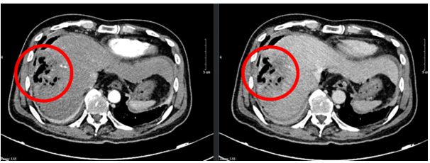 Hình 1: Hình ảnh chụp cắt lớp vi tính ổ bụng: Nhu mô hạ phân thùy S7-8 có khối (vòng tròn đỏ) tỷ trọng hỗn hợp kích thước 81x51mm gồm phần tăng tỷ trọng của vật liệu can thiệp và nhiều bóng khí tạo thành ổ tụ khí trong nhu mô kèm phần hoại tử dạng dịch, không có huyết khồi.