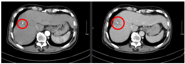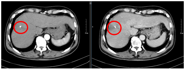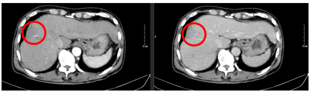 Hình 3: Hình ảnh chụp cắt lớp vi tính ổ bụng: U gan hạ phân thùy VIII (vòng tròn đỏ) kích thước 50x77mm, ngấm thuốc không đều, có thải thuốc sau tiêm sau điều trị, còn tăng sinh mạch, không có huyết khối