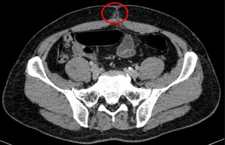 Hình 2: Hình ảnh chụp cắt lớp vi tính ổ bụng: Hình ảnh thâm nhiễm mỡ vùng hạ vị quanh vị trí vết mổ (vòng tròn đỏ).