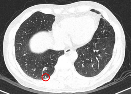 Hình 3: Hình ảnh chụp cắt lớp vi tính lồng ngực: Hình ảnh các nốt đặc rải rác 2 bên phổi, nốt lớn nhất kích thước 4mm (vòng tròn đỏ).