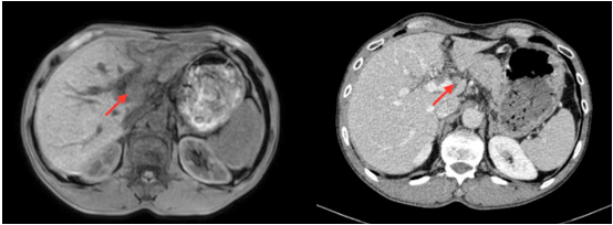 - Bệnh sử: Cách vào viện 1 tháng, bệnh nhân đau tức bụng vùng hạ sườn phải âm ỉ, không sốt, không nôn, không buồn nôn, không bí trung đại tiện, ăn ngủ kém. Bệnh nhân đi khám tại Bệnh viện Việt Tiệp, chụp CT bụng cho hình ảnh: u gan trái kích thước 30x16mm, xâm lấn vào nhánh tĩnh mạch cửa, vài nốt vệ tinh lân cận và huyết khối nhánh xa tĩnh mạch cửa trái; AFP: 13,5 U/mL => Chuyển đến Trung tâm YHHN & Ung bướu Bệnh viện Bạch Mai.