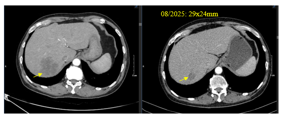 Chụp cắt lớp vi tính bụng: Tổn thương gan phải giảm kích thước: 45x47mm