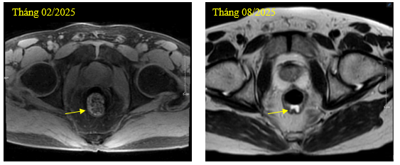 • Chụp cộng hưởng từ vùng chậu: Trực tràng giữa dày thành không đều quanh chu vi, dày nhất 10mm, trên đoạn dài ~34mm ngấm thuốc không đồng nhất sau tiêm (giảm kích thước), lân cận có vài hạch, hạch lớn nhất ~13x10mm (không thay đổi).