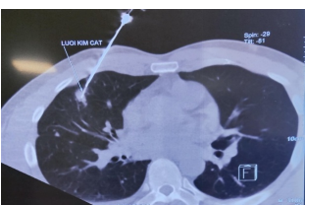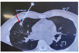 Hình 2: Hình ảnh chọc sinh thiết tổn thương vùng phổi phải dưới hướng dẫn chụp cắt lớp vi tính lồng ngực
