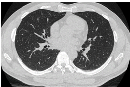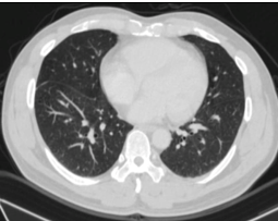 Chụp cắt lớp vi tính lồng ngực: Hình ảnh các nốt kính mờ rãnh liên thùy và màng phổi phải kích thước 2x3mm. Đám dải xẹp phổi thùy giữa phổi phải