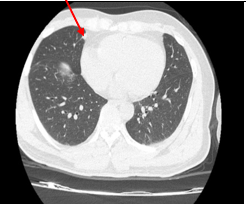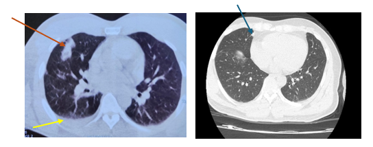 Hình 1: Hình ảnh  cắt lớp vi tính lồng ngực: nốt tổn thương u phổi phải kích thước 10x25mm (mũi tên đỏ), dịch màng phổi phải (mũi tên vàng), tổn thương di căn phổi (mũi tên xanh)