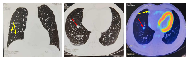 Hình 3: Hình ảnh chụp PET/CT các nốt tổn thương u tại phổi phải (mũi tên đỏ), nốt di căn màng phổi phải (mũi tên vàng)