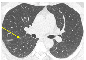 Hình 6: Hình ảnh chụp cắt lớp vi tính lồng ngực: nốt tổn thương u phổi phải nhỏ hơn ban đầu sau 3 tháng điều trị (mũi tên vàng)